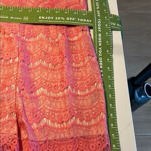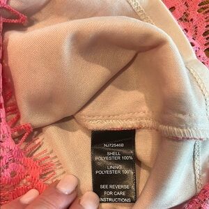 Cap sleeves add coverage.100 percent polyester fabric is super lightweight and breathable. Shorts hit at around the top of the thigh. V-neck shows off your collarbone. Fitted design hugs your curves. Super fun and flirty, this Women's Lace Capsleeve Romper . The lacy pinkconstruction adds a sweet, girly spin to this great piece. SZ L New With Tags