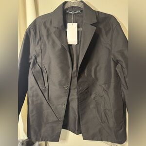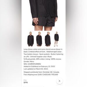Long sleeve cotton and nylon-blend canvas blazer in black. Crinkled effect at front. • Notched lapel collar • Two-button closure • Seam pockets • Button fastening at cuffs • Unlined Supplier color: Black 51% polyamide, 49% cotton. Lining: 100% viscose.