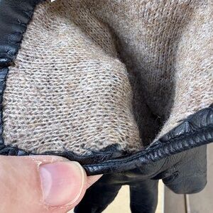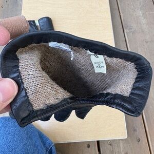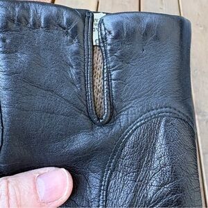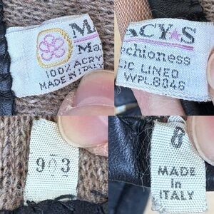 Macy’s Women’s Vintage made in Italy Lined Black Leather Gloves In Sz 8. Super soft leather. Slit at cuff. Knit lining. Good vintage condition with one surface scratch at tip of 1 finger, small section of lining coming undone, & a spot with wear to leather at finger joint( see at end of photos). Please look through all pictures as part of condition