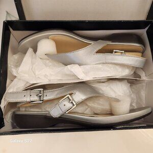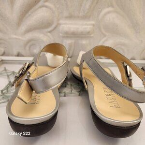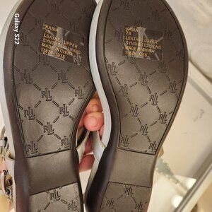Ralph Lauren "Kasia" New Silver Thong sandals. Leather. NIB. Size 7. Brand new in original box/packaging. No rips/stains/scuffs/peeling or wear. Smoke free home. No odors. All offers are welcome. Thank you!