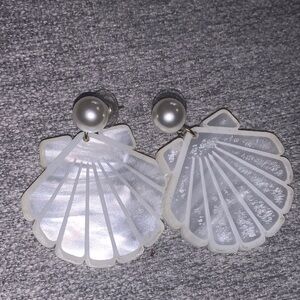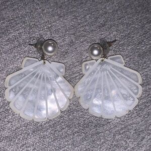 These elegant shell-shaped earrings feature a stunning pearl accent, perfect for adding a touch of sophistication to any outfit. The white and silver tones create a timeless look. Excellent used condition purchased from a boutique