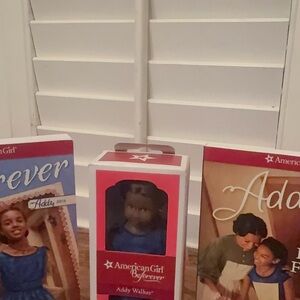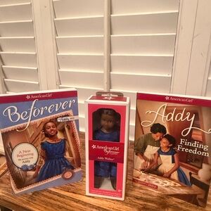 Addy Walker doll in a beautiful blue dress. Includes 'Beforever' and 'Addy: Finding Freedom' books. Great for fans and collectors.