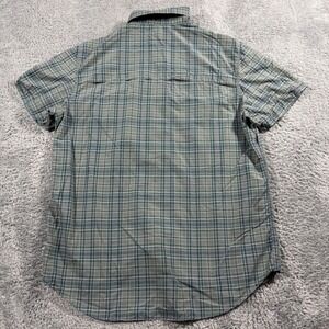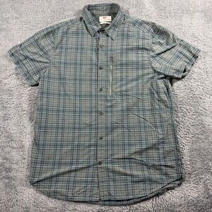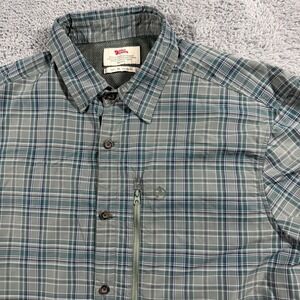 Fjallraven Abisko Hike Short Sleeve Button Up Shirt XL Regular Fit. This men's outdoor shirt features a classic plaid pattern in shades of green and navy. Designed for comfort and functionality, it includes a zippered chest pocket for secure storage and a breathable mesh back panel. A small Swedish flag detail adorns the hem. Perfect for hiking, camping, or casual everyday wear.