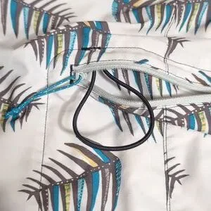 Self-draining pocket on right hip has a noncorroding, recyclable plastic zipper with internal key loop and pull cord; the shorts can also pack into the pocket for travel ease