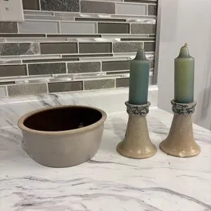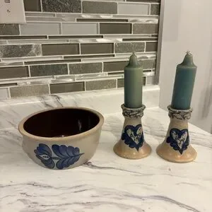 Vintage Beaumont Brothers Pottery Candle Sticks & Bowl Salt Glazed Stoneware