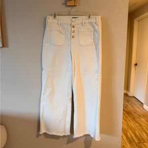 Chic cream wide-leg jeans with button detail. Perfect for versatile styling.