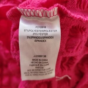 Almost Famous textured popcorn-style blouse with high collar, bright pink. Size L: fitted but very stretchy, shoulders 14", pit-to-pit 16", length 20". Elegant and unique, ideal for a bold, feminine, and trendy look.