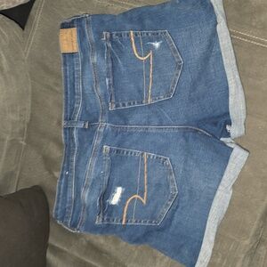 Trendy distressed, cuffed jean shorts. Super Stretch line by American Eagle Outfitters. Dark-medium wash, size 14. Awesome condition!