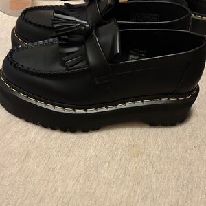 Classic black loafers with tassel detail. Durable leather construction. Iconic Dr. Martens style.