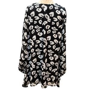 Show Me Your Mumu flowy blouse in a black base with an oversized gray and ivory abstract leopard print. Lightweight and drapey with a split V-neckline and long balloon sleeves finished with elastic cuffs.