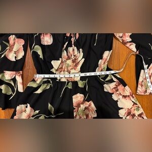 Cute and breezy black romper with a beautiful floral design. Perfect for spring and summer outdoor festivals and events.