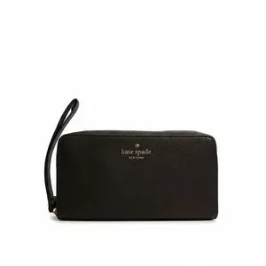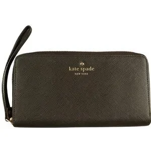 Chic black zippered wallet by Kate Spade. Features a sleek design with a wrist strap.