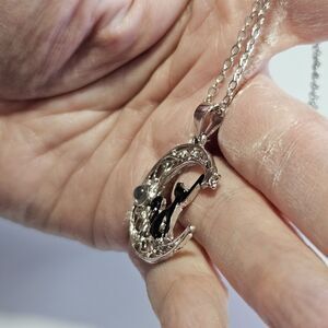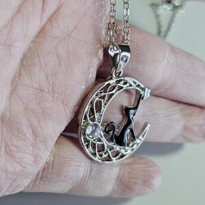 Silver Tone Cat Crescent Moon Pendant Necklace 19 To 20.5". Shipped with USPS Ground Advantage.