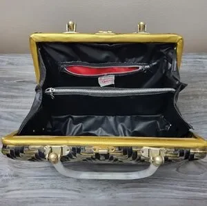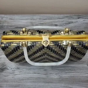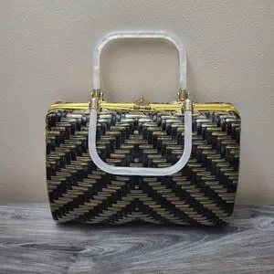 Circa mid century, by Stylecraft Miami, made in Hong Kong. Boxy top handle bag in black and gold metallic woven coated plastic with top gold metal turnlock closure and dual square milky white plastic top handles. Vinyl interior with 3 sections and zip pocket. A few spots where vinyl has ripped from frame on sides. General signs of wear consistent with age. Measures 10" wide x 7" high x 4" deep. Handles have 4" drop.
