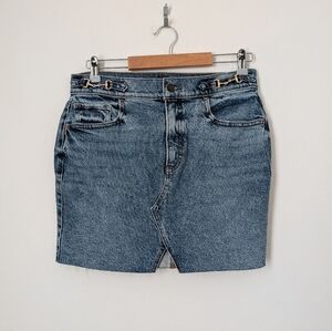 Express Horsebit Mini Jean Skirt in a medium wash blue indigo denim