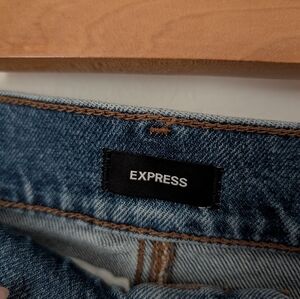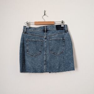 Express Blue Indigo Denim Gold Tone Horsebit Cut Off Raw Hem Jean Mini Skirt