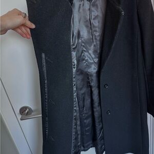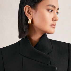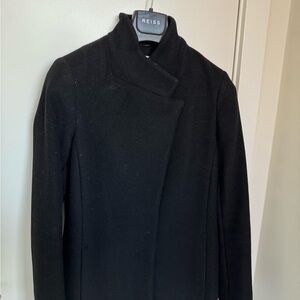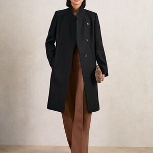 The black Max coat is tailored from a premium wool blend to a clean, figure-skimming silhouette with sharp structure. Its wrapover front and standing collar offer a modern, refined take on cold-weather dressing.