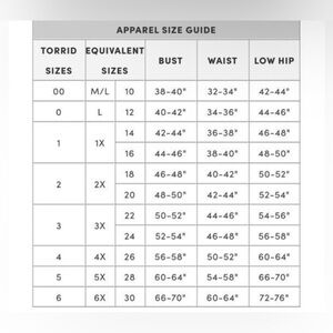 Torrid size 00 is equivalent to a size 10 (up to size 12) or a large. Please see last picture for sizing chart. Stretchy!