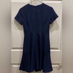 Banana Republic Petite Dark Navy Fit & Flare Short Sleeve Flounce Dress has a hidden back zipper, material feels heavy. Scoop neck.