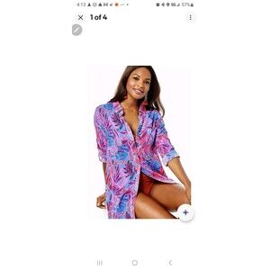 The Lilly Pulitzer 'Natalie' shirtdress cover-up is a stylish and lightweight option for women in size XL. This pink and blue shirt dress falls at knee length and is perfect for covering up at the beach or pool. With its button-down style and brand name reputation, this dress combines comfort and fashion effortlessly.