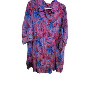 Keywords: pool, beach, cruise, vacation, cover up, swim suit, bathing suit, resort, Hawaii, Caribbean, pink, blue, red, tropical, designer, button up, lightweight, botanical, roll up sleeves, relaxation, trendy, stylish, colorful, vibrant, collar, long sleeve