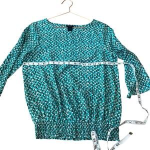 This is an Ann Taylor Factory green geometric print long sleeve top in women's size small.