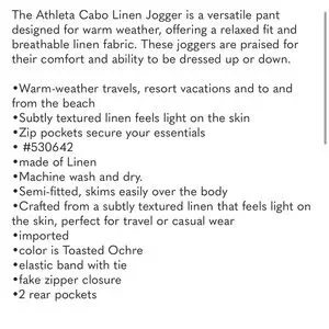 The Athleta Cabo Linen Jogger is a versatile pant designed for warm weather, offering a relaxed fit and breathable linen fabric. These joggers are praised for their comfort and ability to be dressed up or down.