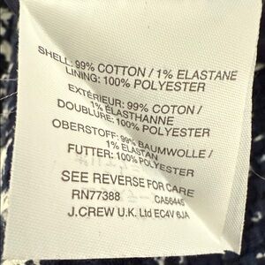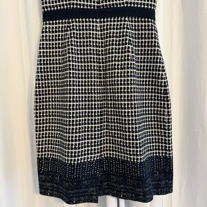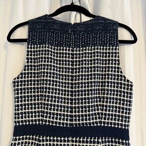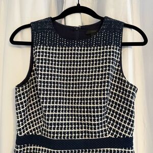 J.Crew navy and white sleeveless sheath dress crafted from a textured cotton blend with a refined, tweed-inspired weave. Designed with a tailored bodice, defined waist, and clean-lined skirt, this dress offers a polished, structured silhouette. Fully lined, this piece works well for spring and summer workwear, professional settings, or daytime events.