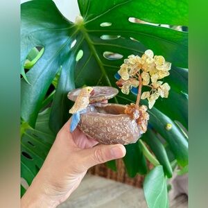 This one-of-a-kind handcrafted piece features a beautifully detailed parrot carved from calcite and agate, perched atop a natural agate geode. Growing from the geode is a citrine gemstone tree, with a delicate citrine crystal nest resting beneath it—creating a powerful scene of abundance, protection, and joy.