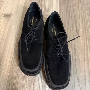 New without box, never worn. Website description: Spanish-made loafers featured in a suede menswear-inspired design with a chunky platform sole and lace-up closure in a two-tone design* Lugged sole* Cushioned insole* Square toe. Size 37, fits a US 6.5-7