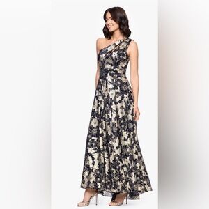 Betsy & Adam Navy and Gold Floral One-Shoulder Long Dress Gown Size 14 NWT