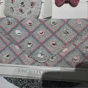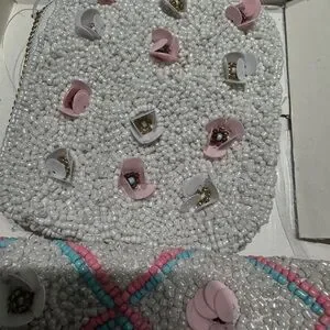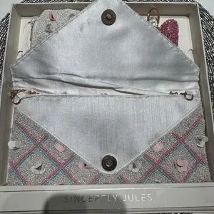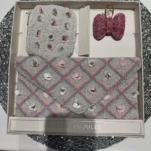 Elegant beaded clutch set by Sincerely Jules. Features a white base with pink and blue accents. Includes a matching keychain.
