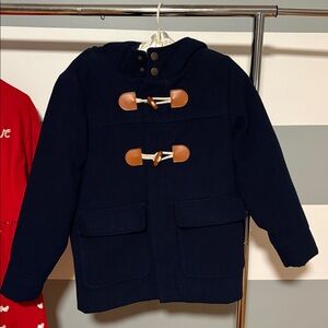 Stylish navy pea coat with tan toggle accents. Perfect for cool weather.