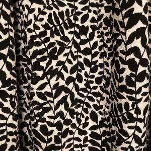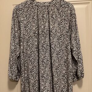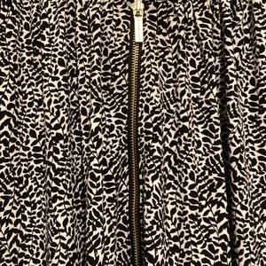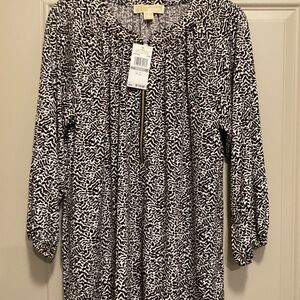 Michael Kors black and white blouse with a floral print, round neckline with a U-shaped slit, zipper closure with a branded pull tab, and long sleeves that can be rolled up to 3/4 length.