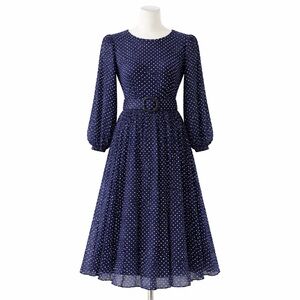 Feminine and timeless Chicwish navy blue polka dot midi dress with a flattering pleated skirt and long sleeves. Features a classic round neckline, defined waist with matching fabric belt, and flowy silhouette that works beautifully for work, church, brunch, or special occasions.