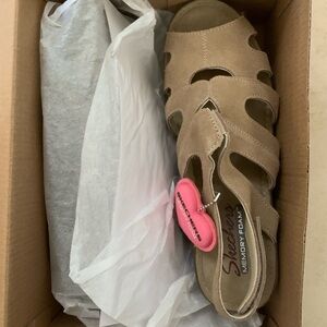 a pair of Skechers Memory Foam wedge sandals. Ideal for casual outings.