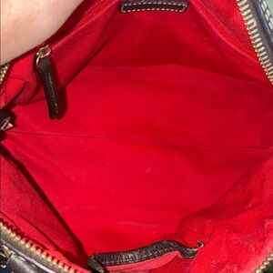 Interior features a bright red lining with one zip and one slip pocket. Zip-top closure.