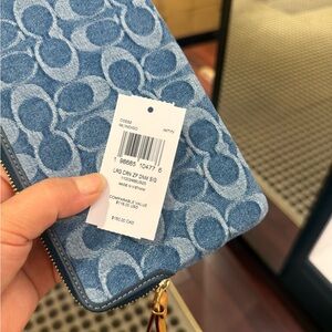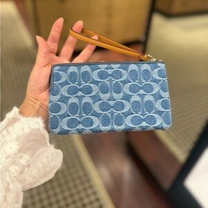 Elegant Coach wristlet in denim blue. Features a tan leather strap. Ideal for everyday use.