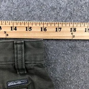 Back details: Two buttoned welt pockets at the rear and a small woven Eddie Bauer logo tab above one back pocket.