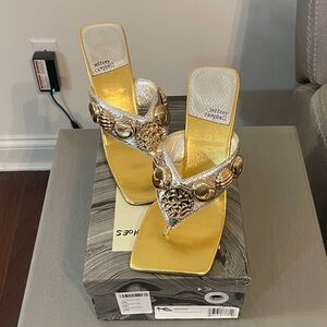 Elegant metallic gold heels with intricate detailing. Perfect for adding a touch of glamour.