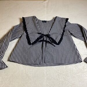 Adorable black & white gingham ASOS top with a cute double tie‑front, long puff sleeves, and an oversized collar with black ruffle trim. Excellent condition.