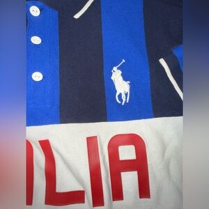 Show your support for your favorite soccer team with this XL Polo Ralph Lauren Italia Football Club T-Shirt. Made of 100% cotton, this shirt features a striped pattern with a collared neckline and short sleeves. The button closure adds a touch of sophistication to this casual shirt, making it perfect for travel, parties, business, and everyday wear. This vintage Polo shirt is a slim fit and comes in a multicolor design, perfect for any season - winter, summer, fall, or spring. It's a must-have for any soccer or football fan and is perfect for showing your support for your favorite team.