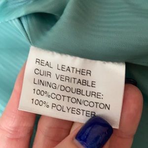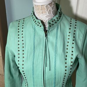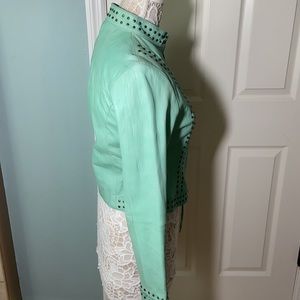 Rare Stunning Essensiel Antwerp leather studded jacket. Crop. Long sleeve flawless lined. Front two way zip. Never worn. No pockets. Smoke free home excellent condition mint greenish blue color. Eye catching. Simply gorgeous can be used as riding jacket or just night out bound to get compliments has some stretch 18” pit to pit 21.5” length 18” sleeve measured flat haven’t seen another like it
