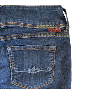 Vintage Y2K Domaine low rise cropped jeans featuring a flattering early-2000s silhouette with a medium to dark blue wash. Designed with a unique asymmetrical triple-button closure, belt loops, and classic front pockets, plus embroidered detailing on the back pockets for that true Y2K denim vibe.