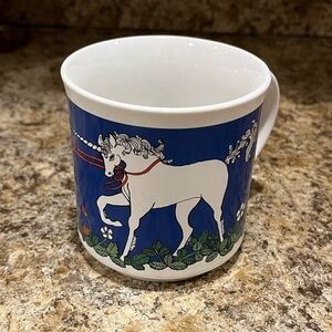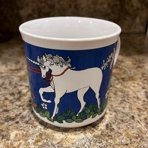 Enjoy your favorite beverage in this charming Recycled Paper Products vintage unicorn mug. Featuring a striking blue and white design, this mug adds a touch of whimsy to your dining collection.