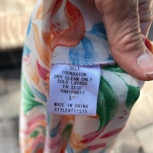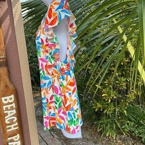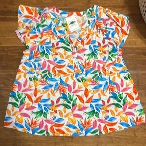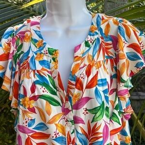 119. Emily Wonder tropical short sleeve top, flirty sleeves, open V neck, Sz L