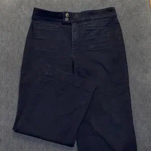 Elegant navy blue high-rise jeans with dual button detail. Versatile and stylish.
