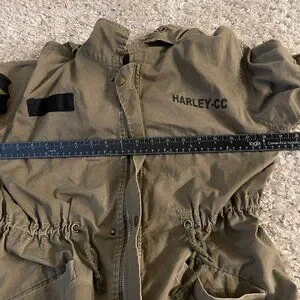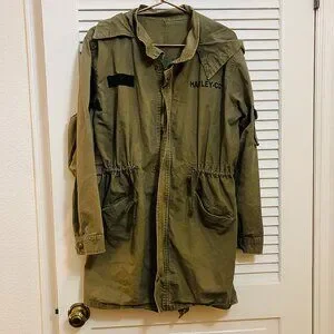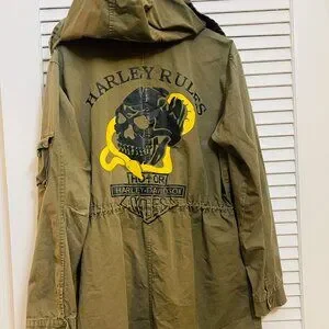 Harley-Davidson olive military-style field jacket with bold skull back graphic. Heavy cotton feel with hood, waist cinch, utility pockets, and sleeve patches. Strong biker-meets-workwear aesthetic.