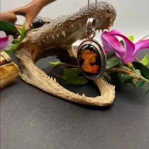 Stunning carved amber cameo pendant necklace with 925 findings by Jane Seymour. Chain is 18 inches and the pendant from bail down is 1.75 inches. Metal was verified using acid test.