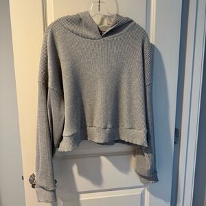 Alo Muse Gray Ribbed Soft Cropped Hoodie, size large. In excellent condition! Stay seriously comfy from studio to street to lounge. The Muse Hoodie is made with a soft ribbed knit and has a relaxed, cropped silhouette and slits at sides. Pair it with the matching sweatpant to master off-duty